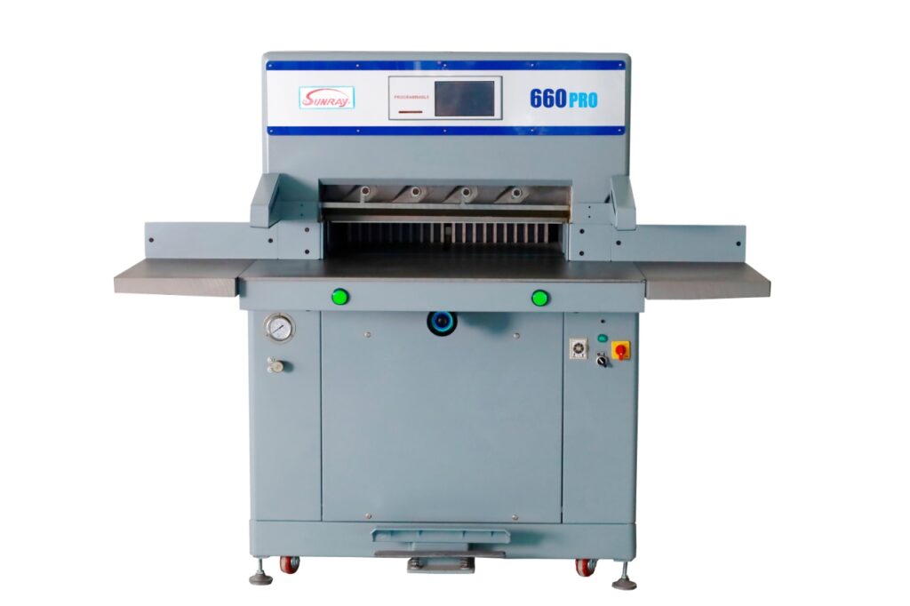 The 660 Pro Hydraulic Cutter effortlessly cuts through large stacks of paper up to 26.5″ wide. Finish stacks of postcards, direct mail, and perfect bound books up to 4″ in height. Program the cuts and sequence for each job using the touchscreen panel. As each cut is performed, the back gauge automatically adjusts for the next cut. The LED light illuminates the cut line, allowing you to see exactly where the cut will be applied, and the foot pedal controls the low pressure clamp to keep the job firmly in place. Simply rotate the job and discard the scraps.